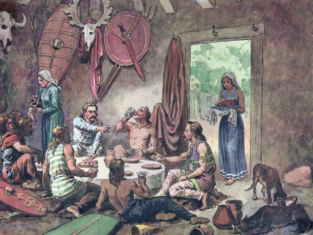 « Du coup, quand ils mangent, leurs moustaches sont engluées de nourriture, et quand ils boivent, le breuvage passe à travers comme par un isthme. Pour dîner, ils s’assoient, non sur des chaises, mais sur le sol, avec, en guise de coussins, des peaux de loups ou de chien. Le service est assuré par de jeunes enfants, garçons et filles. […] Leur coutume, tout au long du repas, est de chercher n’importe quel prétexte pour se défier en combat singulier, au mépris de leur vie. »